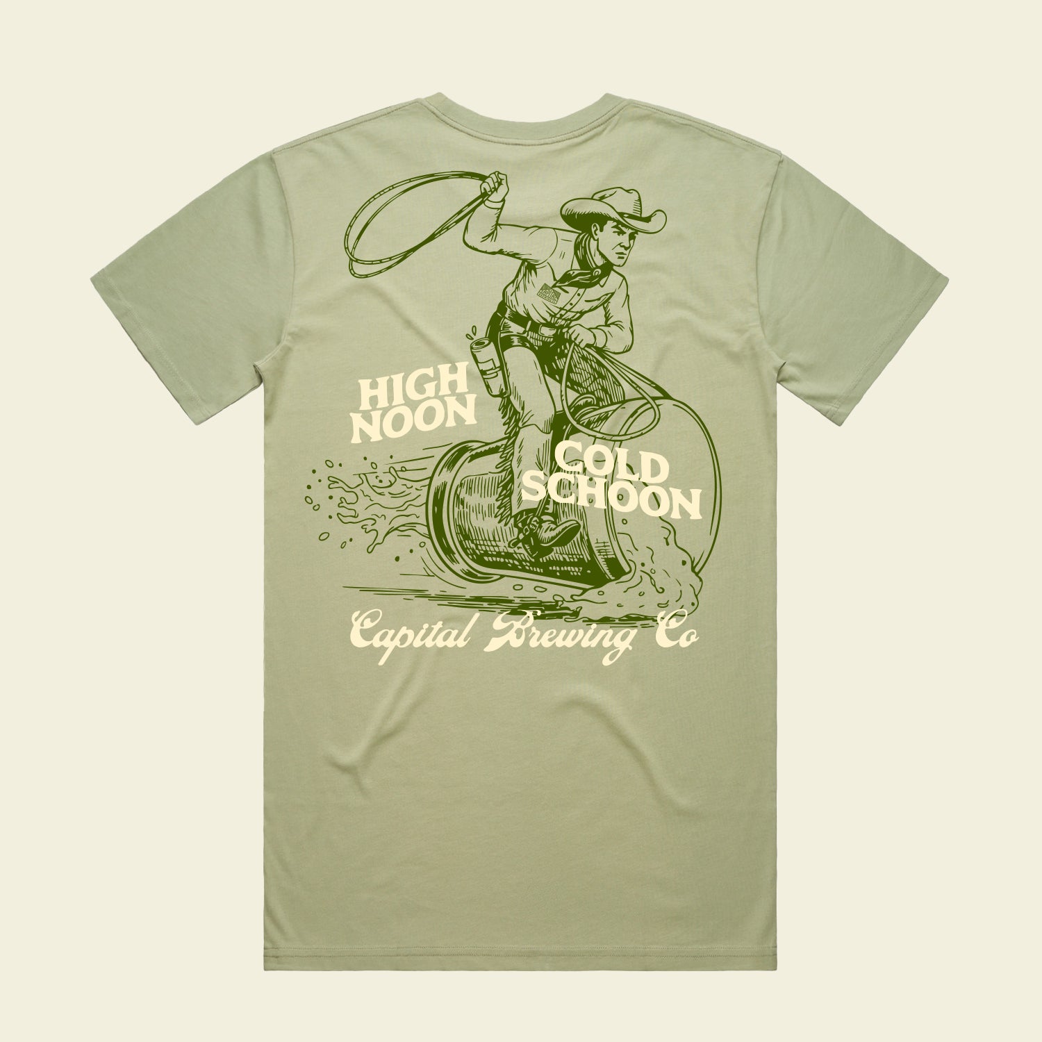 Saddle up, partner. The High Noon Cold Schoon tee is for those who wrangle thirsts and ride straight into Happy Hour. Printed on a dusty eucalyptus cotton that feels as smooth as a fresh pour.